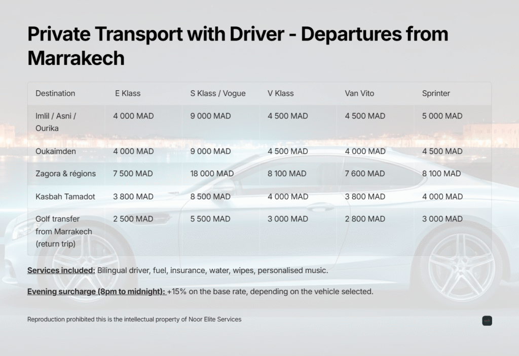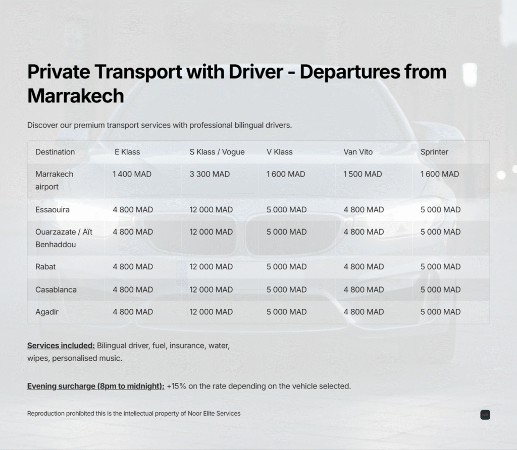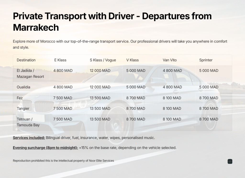 Planning a high-end event or welcoming special guests? Noor Elite Services specializes in elegant, efficient transportation for weddings, VIP delegations, and private celebrations. Our Marrakech Private Transport With Driver solution ensures seamless coordination, polished presentation, and memorable service for your guests. Let us handle the logistics so you can focus on your event.