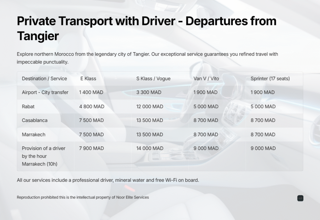 Elevate your journey through the historic port city with Tangier Private Transport With Driver from Noor Elite Services. Whether you're in Tangier for business, tourism, or cross-country connections, our professional chauffeur service delivers high-end comfort, privacy, and punctuality—tailored to your every need.